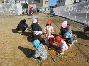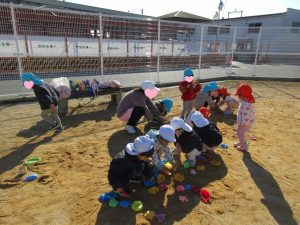 お砂場セットを貸してもらって遊びました。目新しい玩具に興味津々、型抜きやごちそう作りを楽しみました😊