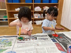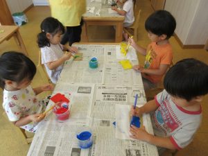 まずは絵の具で色塗りです「ブロッコリー・トマト」