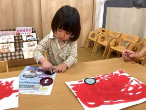 絵の具を塗った画用紙に、タイヤや窓のパーツをスタンプしていきます