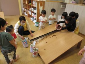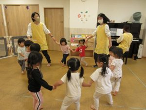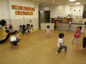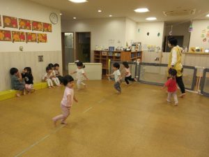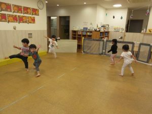 🌈リズム遊びをしました。雨で散歩に行けませんでしたが、思いっきり身体を動かしていた子ども達です😊