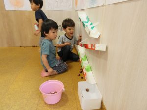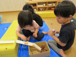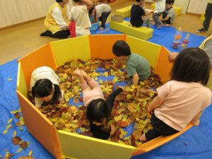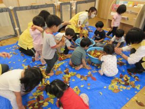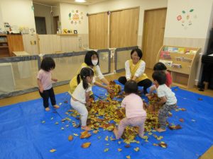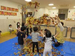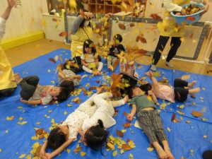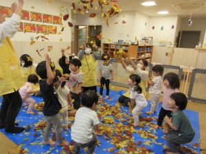 落ち葉のシャワーです🍂「キャー おもしろいね😄」