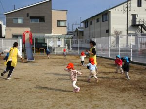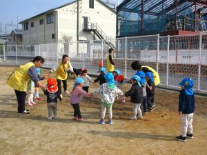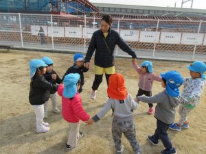 ♪むっくりくまさん むっくりくまさん あなの中 眠っているよ グーグー♪手をつないで輪になって歌います
