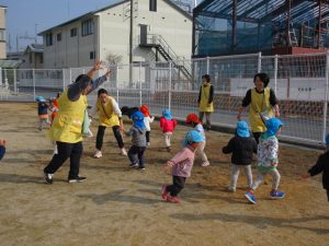 「むっくりくまさん」をして遊びました。繰り返しの中で簡単なルールが分かってきて楽しめるようになってきました。