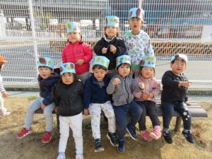 ぶどう組さんは自分で作った落ち葉の冠をかぶって散歩に行きました