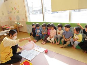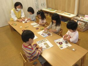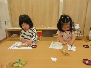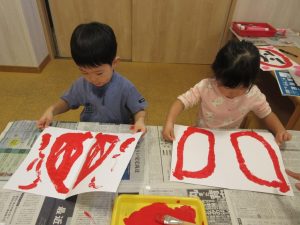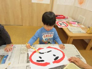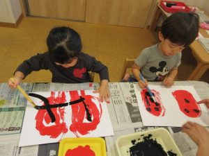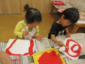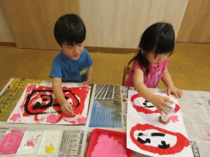 ☆ぶどう組さんは合わせ絵(デカルコマニー)で「だるま」製作をしました