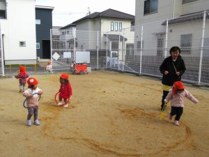 フープの車に乗って地面に描いた道路を走ります。「出発進行‼ 行ってきまーす♪」