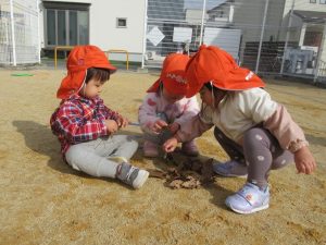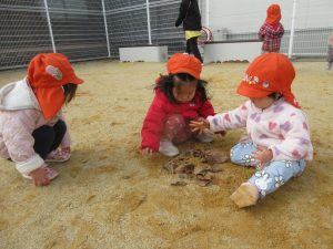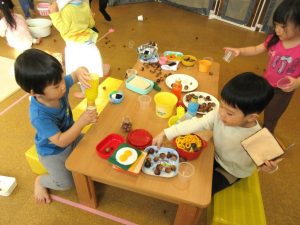 今日はどんぐりを使ってままごとをしました。いつもと違う道具や材料で楽しむ子ども達。「みんなで食べよう。いただきます!」