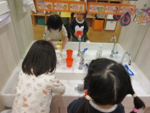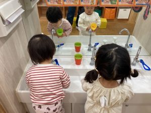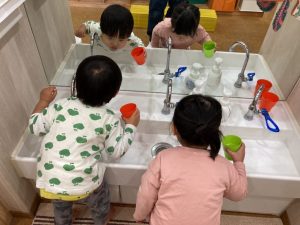 保育者の真似をして口に含んだ白湯を吐き出します(飲んでしまってもいいように白湯をを使用しています)。難しくて飲んでしまうお友だちもいますが繰り返し練習していきたいと思います。
