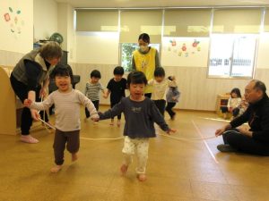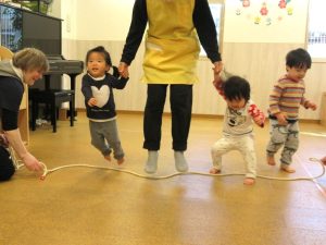 〇ロープをジャンプ!膝を曲げてしっかりととび越えていますね。