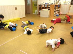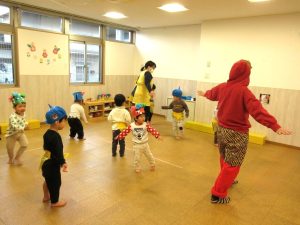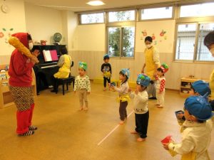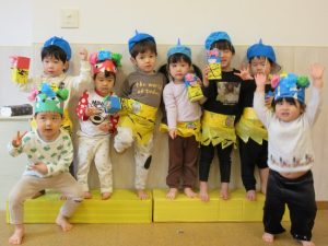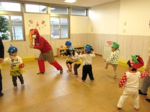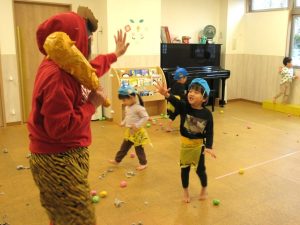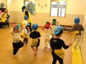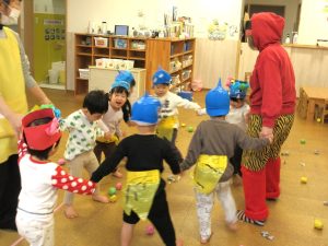 みんなが作った鬼のお面やパンツを履いて鬼の踊りを踊っていると、