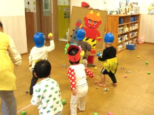 みんなで豆まきです‼「おには~そと!ふくは~うち‼」