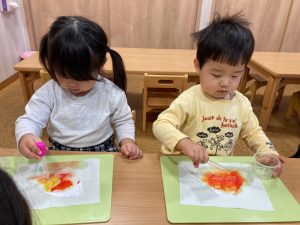 スポイトで水をたらすとじわっと滲んで色が混ざっていきます