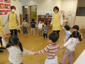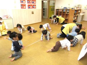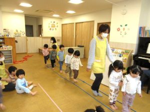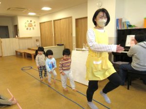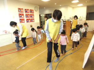 フープとロープで道が出来ました「みんなで並んで歩いてみよう♪」