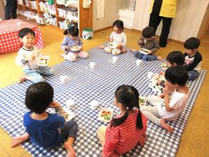 今日はシートを敷いてみんなで食べました「いただきま~す」