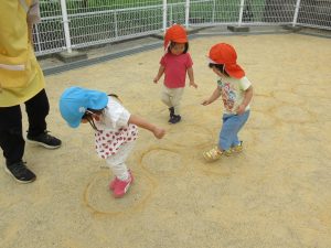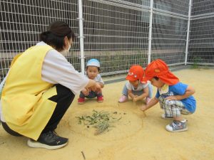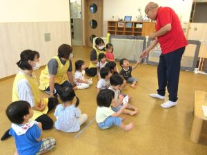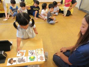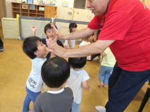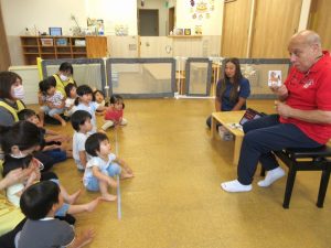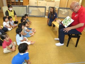 絵本を読んでもらいました。ボブ先生の鳴き真似がとっても上手で興味津々、じーっと見入る子ども達です😊