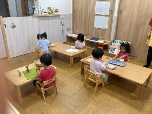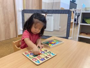 「赤色、同じだね」色と形を合わせてパズルをしています