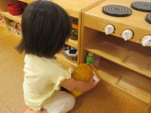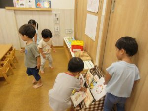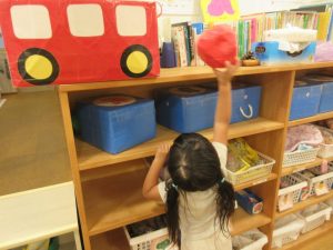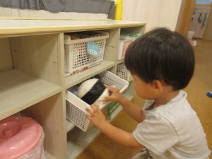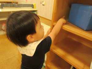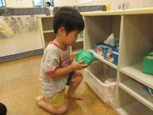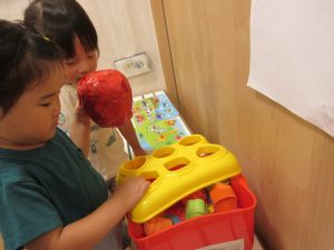 りんご組さんは背伸びをしたり、手を伸ばしたり、ジャンプをして入れようと頑張っています