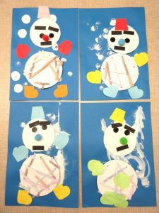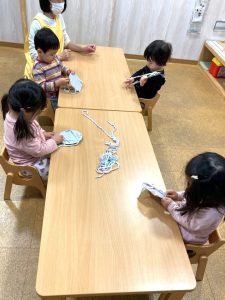 雪だるまが寒くないようにフワフワの毛糸でひも通しをしてお洋服を着せてあげました