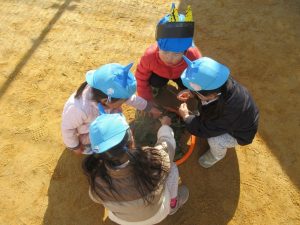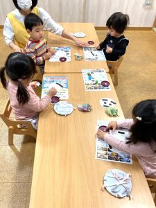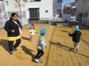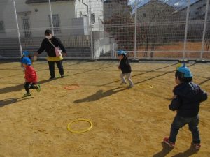 「お引越しゲーム」をしました。オニが「お引越し」と言ったらオニにつかまらないようにフープからフープに移動します。何度か繰り返すうちに遊び方が分かって楽しめるようになってきました。