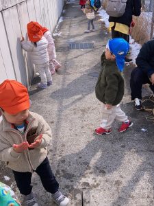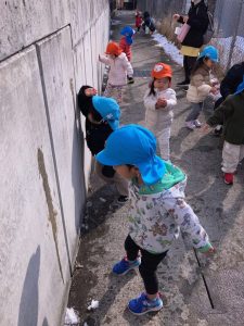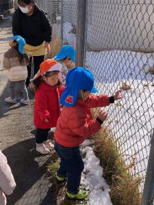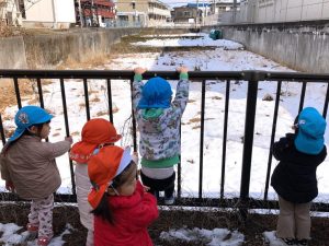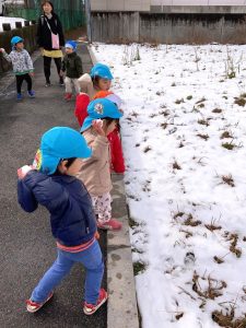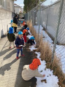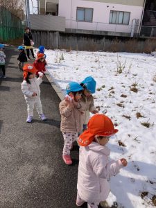 「まだ雪残っているかな⁇」「探しに行きたい!」という子ども達のリクエストに応えて、雪探しの散歩に行きました。屋根の上、車の上等、雪を見つけると「あったよ!」と子ども達です😄♪