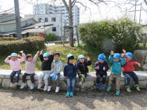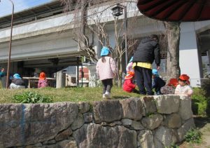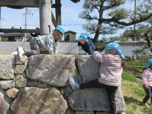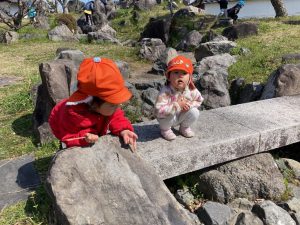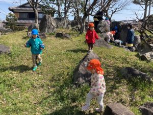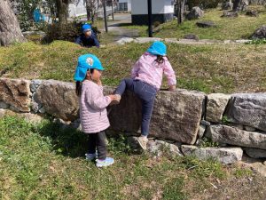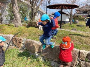 石垣に登ったり、ジャンプして飛び降りたり、築山をかけ下りたり、探索活動をしたり、たくさん身体を動かして遊びました😄♪