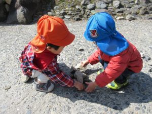こちらでは話をしながら石を積み上げています「お山ができたね♪」