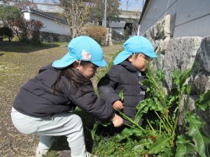 「大きな葉っぱだね。抜いてみよう!うんとこしょ、どっこいしょ」